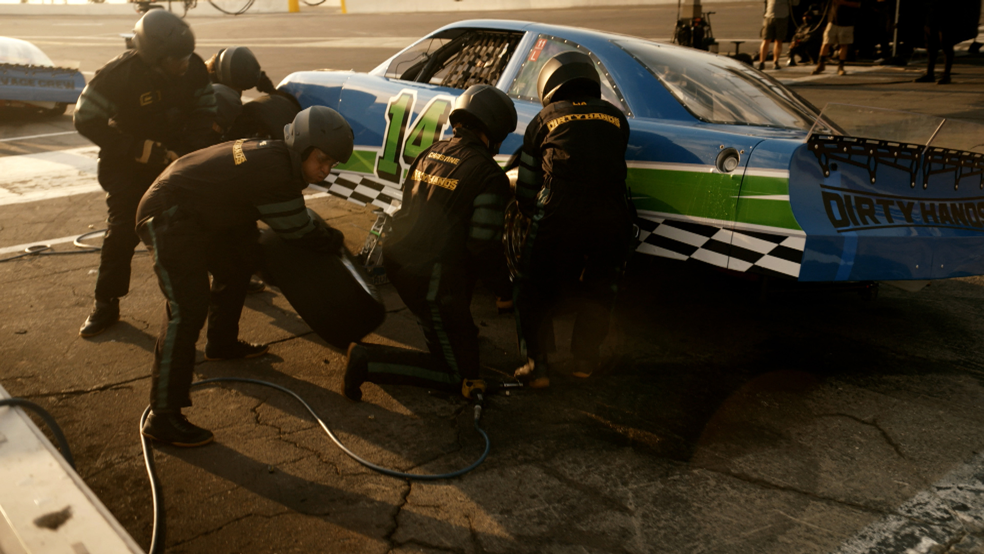 Savage Crew and Dirty Hands race to the Irwindale Speedway in Los Angeles, where they must work together to be the fastest team to complete a race car pit stop.